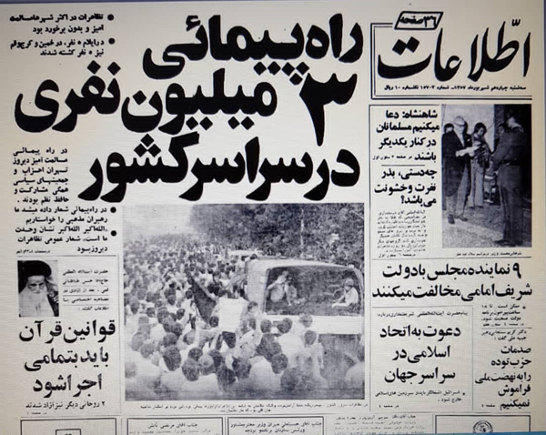 «تظاهرات از ساعت 6 بامداد آغاز شد و ادامه آن تا نیمه شب طول کشید. خبر تظاهرات امروز به عنوان یک نمایش بزرگ و بیسابقه به سراسر جهان مخابره شد. تظاهرکنندگان در بسیاری از نقاط در طول مسیر فریاد میزدند «نهضت ما حسینی، رهبر ما خمینی». دهها وانتبار برای تظاهرکنندگان آذوقه حمل میکردند و وانتبارها خود را به صف راهپیمایان میرساندند و بین آنها آذوقه پخش میکردند. در پارهای از خیابانها به محض اینکه صف تظاهرکنندگان مقابل گلفروشیها میرسید، گلفروشها، گلها را میان مردم تقسیم میکردند. دهها نفر شاخههای گل را در سر چهارراهها نثار مأموران انتظامی میکردند.»(1)