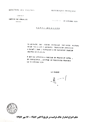 « ....کمی بعد به من گفته شد که باید با یک تلفن فوری در کاخ الیزه صحبت کنم. تلفن کننده شخص شاه بود. وی از اینکه او را در جریان تصمیم خود گذاشته بودیم تشکر کرد و گفت تصمیم به اخراج آیتالله مربوط به فرانسه است و دولت ایران هیچ گونه مسئولیتی به عهده نمیگیرد. ولی اگر پس از اخراج، چگونگی امر از وی سوال شود خواهد گفت با این اقدام موافق نبوده است....»