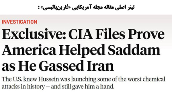 یک اعتراف تکاندهنده | چندی پیش مجله آمریکایی فارین پالیسی - Foreign Policy – با استناد به مدارک و اسناد معتبری که از طبقهبندی محرمانه خارج شده بود، طی گزارشی به نقش سازمانهای اطلاعاتی آمریکا – cia و dia در تحریک رژیم صدام به کاربرد سلاحهای شیمیایی علیه نیروهای ایرانی اعتراف کرد.